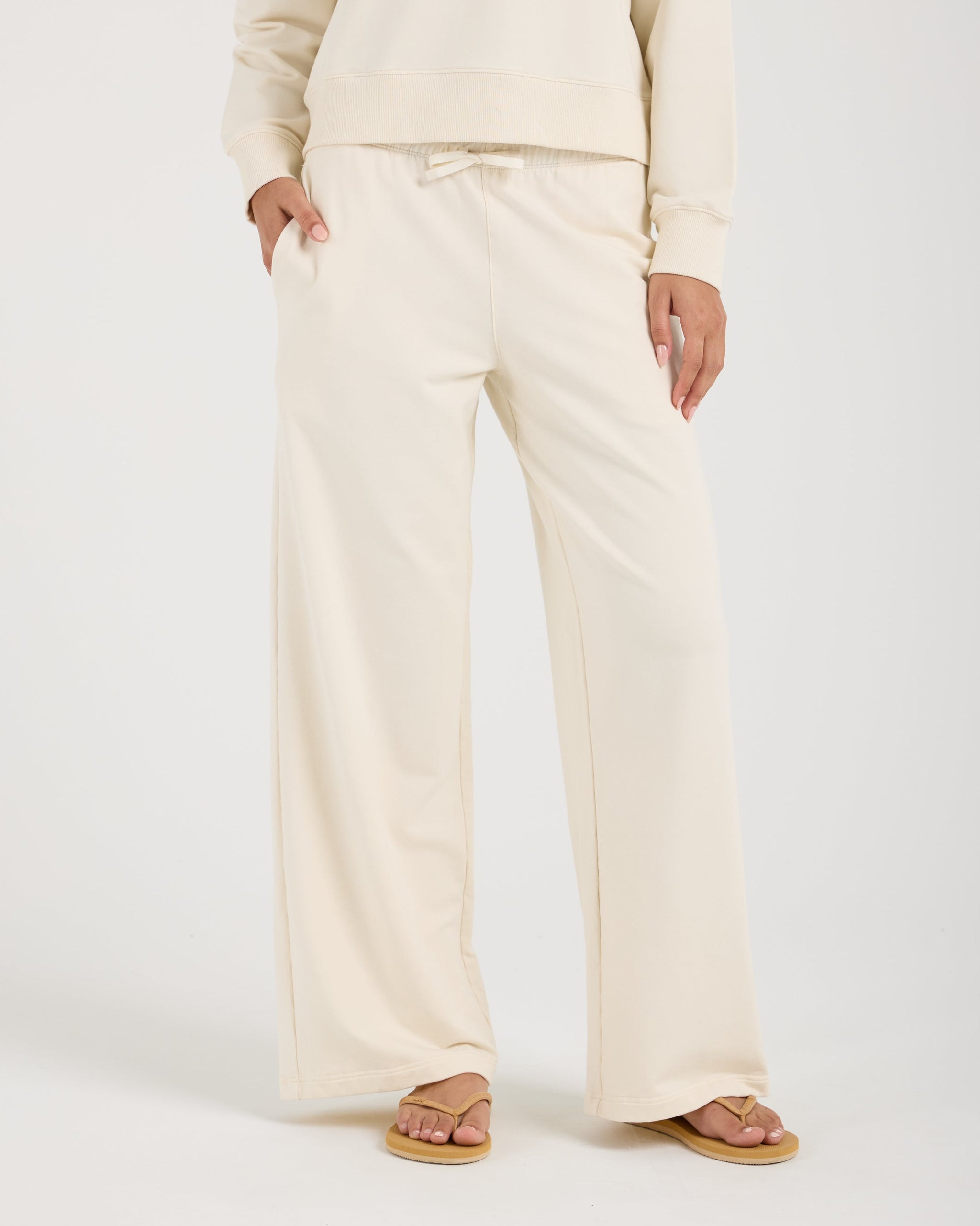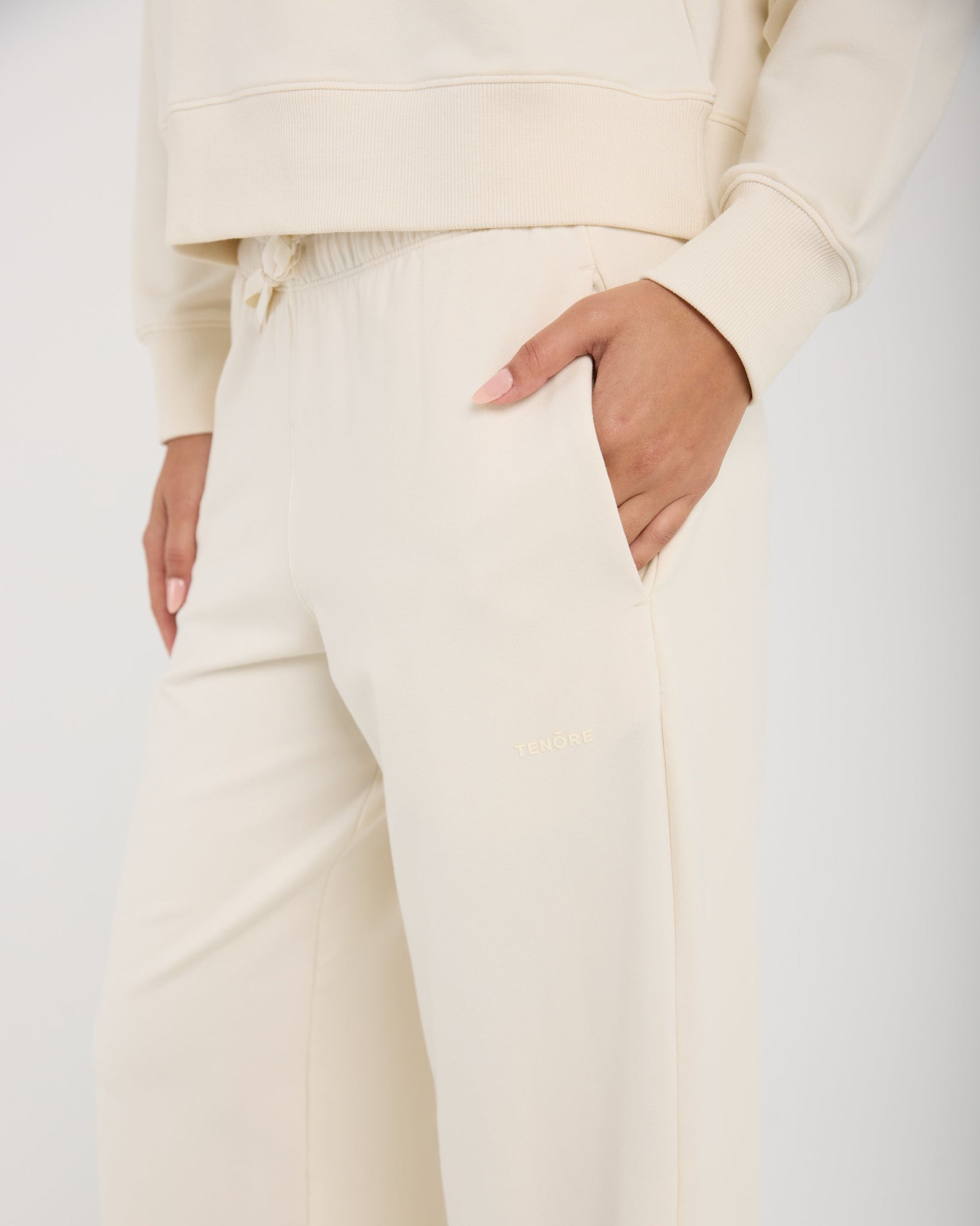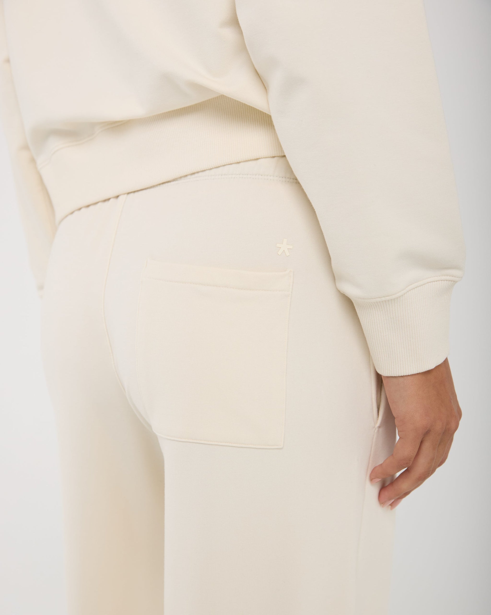 Soft-touch open-leg pant with a sport-inspired fit for training, recovery, and travel. Cotton-modal-spandex fabric blend with terry loop backing and a concealed zipper pocket to keep essentials secure.